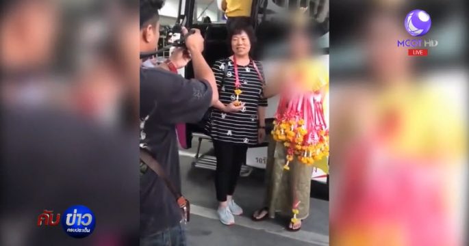 พนักงานสาวแต่งชุดไทยคล้องพวงมาลัยให้กับนักท่องเที่ยวชาวจีน เข้าพบ พล.ต.ต.สุรเชษฐ์ รองผู้บัญชาการตำรวจท่องเที่ยว แจงที่หน้าบึ้งเพราะอากาศร้อน และรู้สึกเพลีย ขอโทษที่ทำให้เกิดผลกระทบต่อสังคมไทย