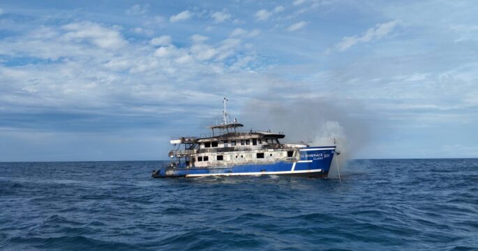 ไฟไหม้เรือกลางทะเล จุดดำน้ำเขาหลัก จ.พังงา ช่วยนักท่องเที่ยวขึ้นฝั่งปลอดภัย คาดต้นเพลิงเกิดบริเวณห้องเครื่อง ก่อนลามไปห้องโถงผู้โดยสาร