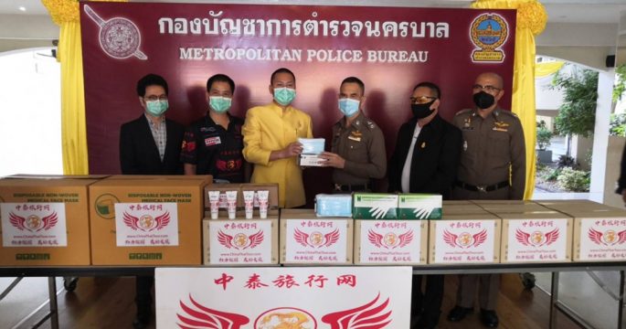 นักธุรกิจจีน มอบหน้ากากอนามัย ถุงมือ เจลแอลกอฮอล์ ให้เจ้าหน้าที่ตำรวจใช้ป้องกันโควิ-19 ขณะปฏิบัติหน้าที่