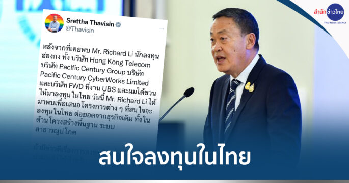 นายกฯ เผย หลังพบ “ริชาร์ด หลี่” นักธุรกิจฮ่องกง สนใจลงทุนในไทยต่อยอดโครงการสาธารณูปโภคพื้นฐาน