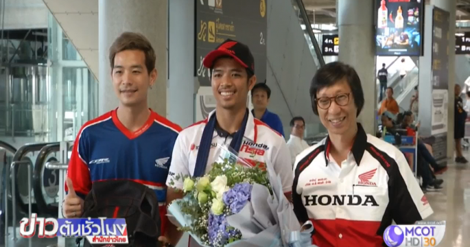 ก้อง สมเกียรติ นักบิดจากโครงการเรซ ทู เดอะ ดรีม ของเอพี ฮอนด้า เดินทางกลับถึงสนามบินสุวรรณภูมิแล้ว หลังเข้ารับการผ่าตัดอาการตึงที่แขน จากประเทศสเปน
