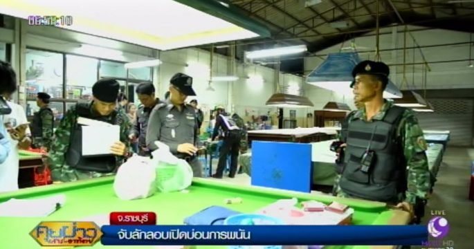 ตำรวจบุกจับบ่อนกลางเมืองราชบุรี รวบนักพนันกว่า 30 คน พบของกลางทั้งโพยบอล อุปกรณ์การเล่น ไพ่ ไพ่นกกระจอก