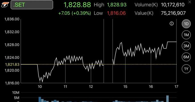 ตลาดหลักทรัพย์ฯ ปิดวันนี้ที่ระดับ 1,828.88 จุด เพิ่มขึ้น 7.05 จุด (+0.39%) มูลค่าการซื้อขาย 75,216.91 ล้านบาท