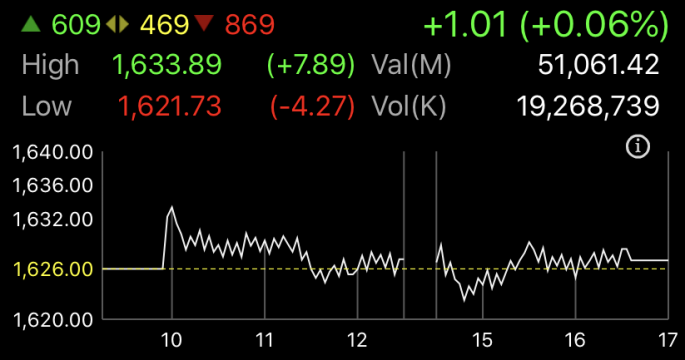 ตลาดหลักทรัพย์ปิดวันนี้ที่ระดับ 1,627.01 จุด เพิ่มขึ้น 1.01 จุด (+0.06%) มูลค่าการซื้อขาย 51,061.42 ล้านบาท