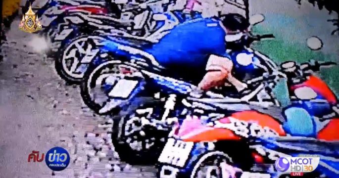 คนร้ายแต่งกายในชุดออกกำลังกาย ทำทียืดเส้นยืดสาย บริเวณจุดจอดรถจักรยานยนต์สวนสาธารณะ สบโอกาสงัดเบาะรถฉกทรัพย์หลบหนี