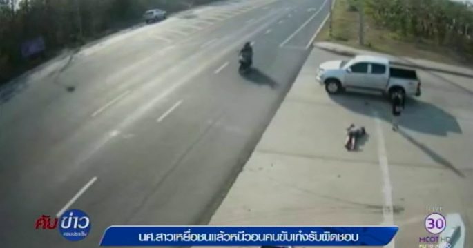 นศ.สาว เหยื่อรถเก๋งเลี้ยวปาดหน้าชน จยย. หน้าศูนย์ราชการจังหวัดบุรีรัมย์ แล้วขับหนี วอนรถเก๋งออกมารับผิดชอบ