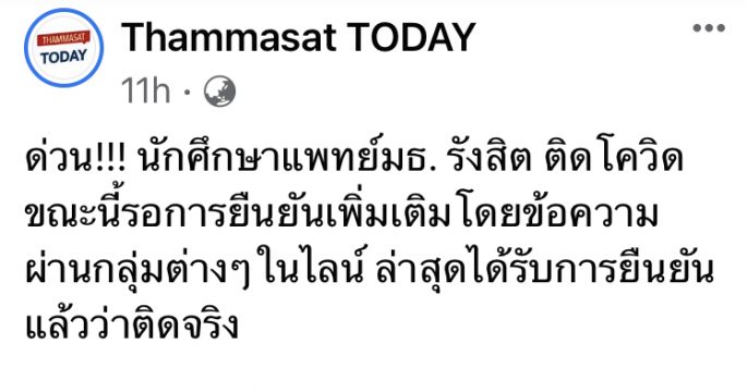มธ.แจงพบนักศึกษาติดโควิด 1 คน เป็นนักศึกษาแพทย์ชั้นปี 4 คาดติดจากคนไข้ที่ให้การดูแล เผยผลตรวจกลุ่มเสี่ยง 47 คนไม่พบใครติดเชื้อ