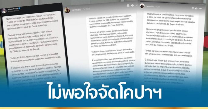 นักเตะทีมชาติบราซิล ไม่พอใจรัฐบาลที่รับเป็นเจ้าภาพจัดฟุตบอลโคปา อเมริกา 2021 แทนโคลอมเบีย-อาร์เจนตินา แต่ยืนยันจะลงแข่งขัน ขณะที่บราซิลมีผู้ติดเชื้อโควิดแล้วกว่า 17 ล้านคน เสียชีวิตกว่า 4 แสนคน