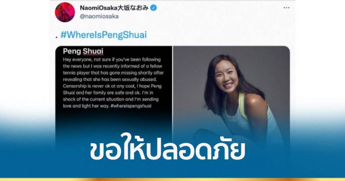 โอซากะ ห่วง ‘เผิง ฉ่วย’ นักเทนนิสสาวจีนหายตัวไป ขอให้ปลอดภัย