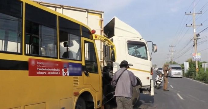 เกิดอุบัติเหตุถนนสายบางปะกง-ฉะเชิงเทรา รถบัสรับ-ส่งนักเรียน เบรคไม่ทันถูกรถบรรทุกล้อเลี้ยวตัดหน้ากระชั้นชิดชนเข้าเต็มแรง เจ็บกว่า 20 ราย