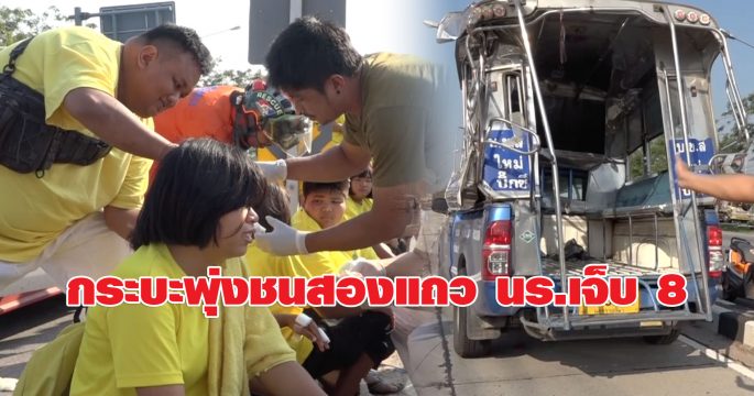 รถกระบะพุ่งชนรถสองแถวที่มีนักเรียนโดยสารมาเต็มคันรถ บนถนนมิตรภาพ ทางคู่ขนานขาออก อ.เมืองนครราชสีมา นักเรียนบาดเจ็บ 8 คน
