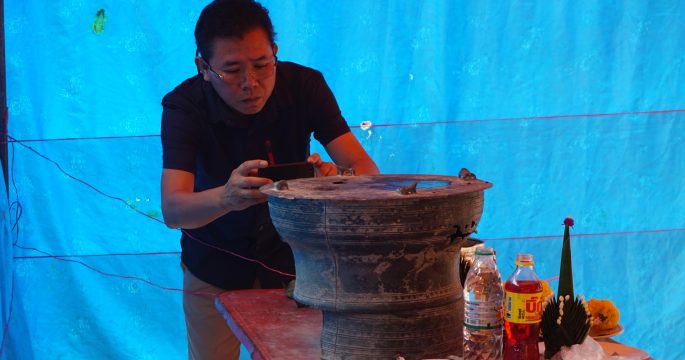 นักโบราณคดีเก็บรายละเอียดข้อมูลกลองสำริดที่ชาวบ้านนครพนมขุดพบ เตรียมขึ้นทะเบียนเป็นสมบัติของชาติ ระบุเป็นกลองโบราณใช้ในพิธีศักดิ์สิทธิ์ สันนิษฐานสร้างในยุคองค์พระธาตุพนม