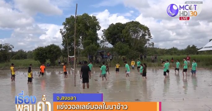 นักศึกษาแพทย์แข่งวอลเลย์บอลในโคลนกลางนาข้าว ก่อนร่วมดำนาเรียนรู้วิถีชีวิตชาวนาไทยที่ ต.นาหมอศรี อ.นาทวี จ.สงขลา ซึ่งกำลังถูกพัฒนาให้เป็นแหล่งท่องเที่ยวแห่งใหม่