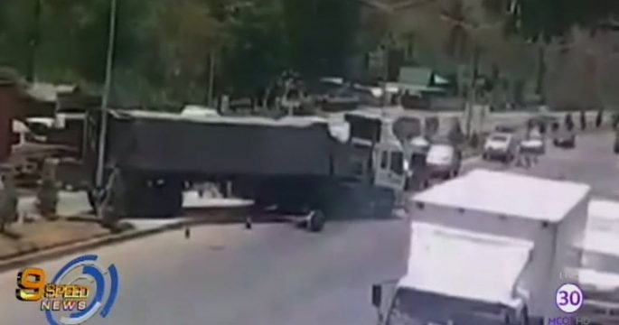 นาทีระทึกรถพ่วงพุ่งชนด่านตรวจบนถนนสายแม่สอด-ตาก