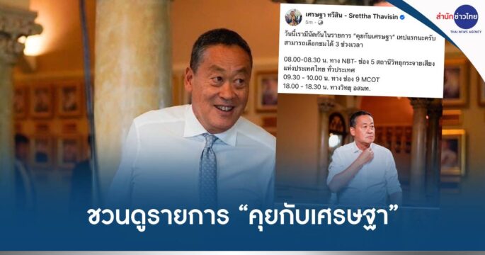 นายกฯ โพสต์ เชิญชวนรายการ “คุยกับเศรษฐา” ออกอากาศเทปแรกวันนี้ เลือกชมได้ 3 ช่วงเวลา
