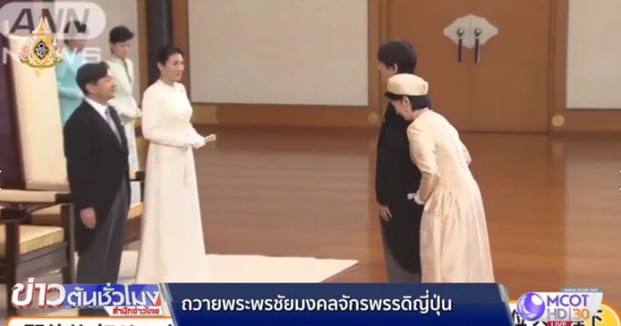 สมเด็จพระจักรพรรดินารุฮิโตะและสมเด็จพระจักรพรรดินีมาซาโกะเสด็จออก ณ ห้องต้นสนภายในพระราชวังอิมพีเรียล เพื่อทรงรับการถวายพระพรชัยมงคลจากพระบรมวงศานุวงศ์