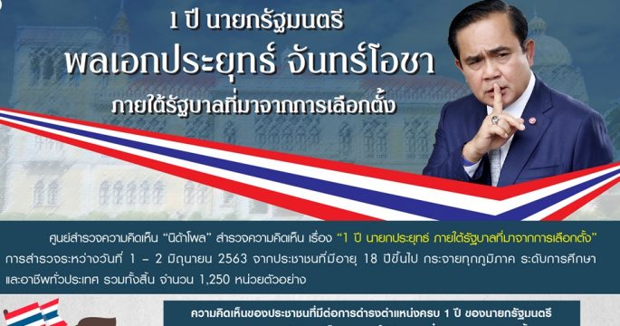 นิด้าโพลสำรวจความเห็นประชาชน “1 ปี นายกประยุทธ์ภายใต้รัฐบาลที่มาจากการเลือกตั้ง” พบประชาชนส่วนใหญ่ให้ผ่านทุกด้าน ทั้งการทำงานในตำแหน่งนายกฯ อุดมการณ์ การกล้าตัดสินใจ บุคคลิกภาพ ประสิทธิภาพในการทำงาน และความโปร่งใส