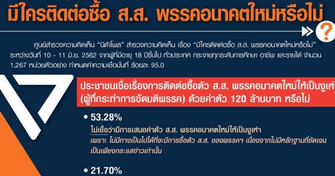 นิด้าโพล สำรวจความเห็นประชาชน เรื่องมีใครติดต่อซื้อส.ส.พรรคอนาคตใหม่ หรือไม่ พบร้อยละ 53.28 ไม่เชื่อว่ามีการเสนอค่าตัวให้ส.ส. และร้อยละ 77.27 เห็นว่าพรรคควรนำหลักฐานออกมาแสดง เพื่อเอาผิดคนที่มาติดต่อซื้อตัว ส.ส. และดำเนินการตามกฎหมายต่อไป