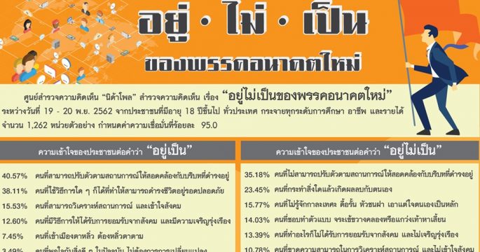 นิด้าโพลเผยผลสำรวจความเห็น เรื่องอยู่ไม่เป็นของพรรคอนาคตใหม่ ด้านการติดตามข่าว “อยู่ไม่เป็น” พบประชาชนส่วนใหญ่ ร้อยละ 65.21 ระบุว่า ไม่ติดตามเลย ร้อยละ 27.73 ระบุว่า ติดตามบ้าง