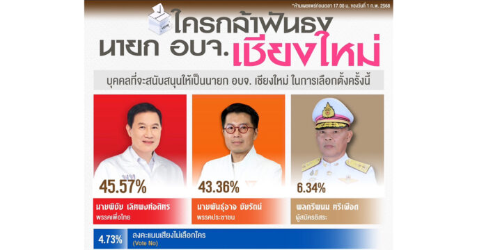กรุงเทพฯ 1 ก.พ.- นิด้าโพล เผย ผลสำรวจความคิดเห็น พบนายก อบจ.เชียงใหม่ คะแนนสูสี “พิชัย” เพื่อไทย – “พันธุ์อาจ” ประชาชน ศูนย์สำรวจความคิดเห็น “นิด้าโพล” สถาบันบัณฑิตพัฒนบริหารศาสตร์ (นิด้า) เปิดเผยผลการสำรวจของประชาชน เรื่อง “ใครกล้าฟันธง นายก อบจ. เชียงใหม่” ทำการสำรวจระหว่างวันที่ 29-30 มกราคม 2568 จากประชาชนที่มีอายุ 18 ปีขึ้นไป และมีสิทธิเลือกตั้งในจังหวัดเชียงใหม่ กระจายทุกระดับการศึกษา อาชีพ และรายได้ รวมจำนวนทั้งสิ้น 1,310 หน่วยตัวอย่าง เกี่ยวกับการเลือกตั้งนายกองค์การบริหารส่วนจังหวัดเชียงใหม่ การสำรวจอาศัยการสุ่มตัวอย่างโดยใช้ความน่าจะเป็นจากบัญชีรายชื่อฐานข้อมูลตัวอย่างหลัก (Master Sample) ของ “นิด้าโพล” สุ่มตัวอย่างแบบหลายขั้นตอน (Multi-stage Sampling) เก็บข้อมูลด้วยวิธีการสัมภาษณ์ทางโทรศัพท์ โดยกำหนดค่าความเชื่อมั่น ร้อยละ 97.0 จากการสำรวจเมื่อถามถึงบุคคลที่จะสนับสนุนให้เป็นนายกองค์การบริหารส่วนจังหวัดเชียงใหม่ ในการเลือกตั้งครั้งนี้ พบว่า ตัวอย่าง ร้อยละ […]