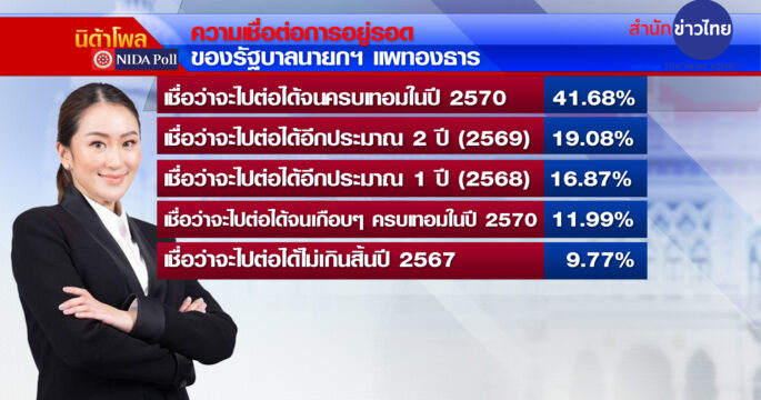 นิด้าโพล เผยคนส่วนใหญ่ไม่เชื่อ “แพทองธาร” บริหารประเทศโดยปราศจาก “ทักษิณ” ชี้ไม่ควรดำรงตำแหน่งใด แค่ให้คำปรึกษาในฐานะพ่อ-ลูก