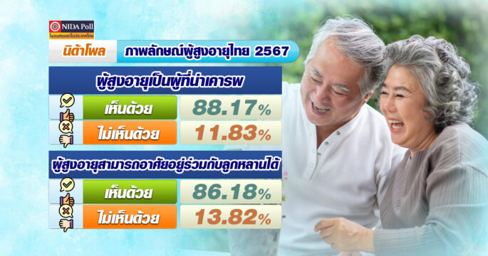 นิด้าโพล เผยผลสำรวจ มุมมองคนไทยต่อภาพลักษณ์ผู้สูงอายุ 2567 พบว่า คนส่วนใหญ่ยังยกให้ผู้สูงอายุเป็นผู้ที่น่าเคารพ เป็นที่พึ่งของลูกหลาน และสามารถทำงานเลี้ยงดูตัวเองได้
