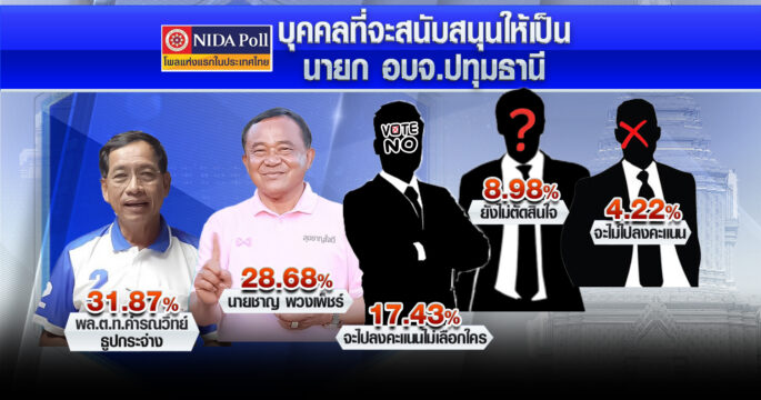 ผลสำรวจ “นิด้าโพล” ประชาชนหนุน “พล.ต.ท.คำรณวิทย์” เป็นนายก อบจ.ปทุมธานี ส่วนกรณี “ทักษิณ” ลงพื้นที่ ไม่มีผลผลกระทบต่อการตัดสินใจ