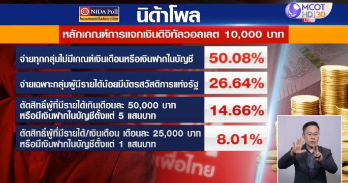 นิด้าโพลเผยผลสำรวจความเห็นประชาชนต่อหลักเกณฑ์แจกเงินดิจิทัลวอลเล็ต 10,000 บาท พบ 50.08% หนุนจ่ายทุกกลุ่มโดยไม่ต้องมีเกณฑ์เงินเดือนหรือเงินฝากในบัญชีมาเป็นข้อจำกัด และไม่จำกัดพื้นที่ใช้จ่าย มองระยะเวลาใช้ภายใน 6 เดือน