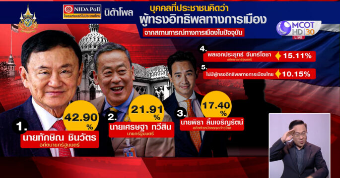 นิด้าโพลเผยผลสำรวจ 42.90% ชี้ “ทักษิณ ชินวัตร” เป็นผู้ทรงอิทธิพลทางการเมือง ส่วนผู้ที่น่าเห็นใจทางการเมือง คือ “พิธา-ธนาธร”