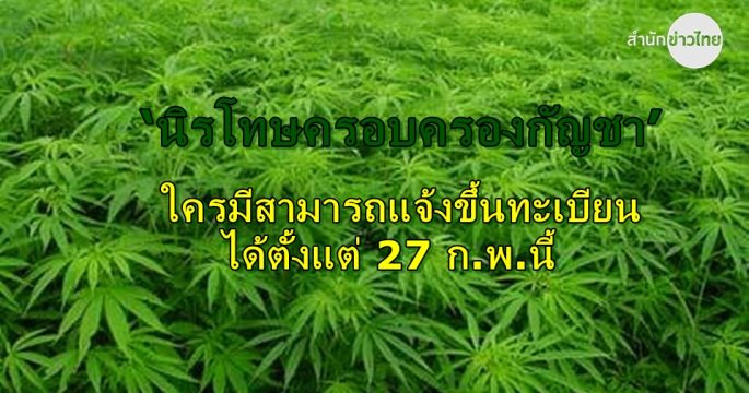 ราชกิจจาฯประกาศ‘นิรโทษครอบครองกัญชา’ใครมีครอบครองแจ้งขึ้นทะเบียนได้ตั้งแต่ 27 ก.พ.นี้ กรุงเทพฯแจ้งที่ อย. ต่างจังหวัด แจ้งที่สำนักงานสาธารณสุขจังหวัดทั่วประเทศ