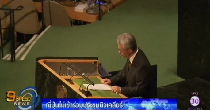 นายโนบุชิเกะ ทาคามิซาวา ทูตญี่ปุ่นประจำสหประชาชาติกล่าวสุนทรพจน์ที่สหประชาชาติ ว่าญี่ปุ่นจะไม่เข้าร่วมการประชุมเจรจาร่างสนธิสัญญาห้ามถือครองอาวุธนิวเคลียร์