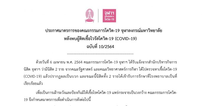จุฬาฯ ออกประกาศหลังพบนิสิต 2 รายติดโควิด