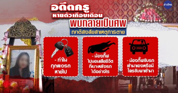 “น้องกิ๊ฟ” อดีตครูหายตัวไปเกือบ 1 เดือน พบอีกทีเป็นร่างไร้วิญญาณในรถยนต์บนลานจอดของโรงพยาบาล ญาติยังติดใจสาเหตุวอนตำรวจตรวจสอบกล้องวงจรปิด ไขข้อสงสัย