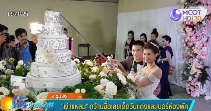 “เจ้าแหลม-น้องจ๊ะจ๋า” ฉลองวิวาห์ชื่นมื่น ผู้ว่าฯ ยินดีต้อนรับเป็นเขยชุมพร พ่อค้าลอตเตอรี่เผย “เจ้าแหลม” กว้านซื้อเลขเด็ดวันแต่งและเบอร์ห้องพัก 11 และ 22 เกลี้ยงแผง ขณะที่คนในงานต่างซื้อเลขเด็ดเป็นทะเบียนรถของ “เจ้าแหลม” จำนวนมาก