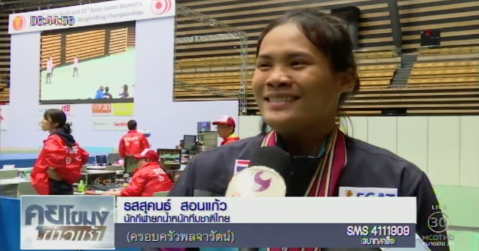 นางบุษบา ยอดบางเตย นายกสมาคมกีฬายกน้ำหนักสมัครเล่นไทย ชื่นชม รสสุคนธ์ สอนแก้ว หนึ่งในนักกีฬาแข่งขันกีฬายุวชนและเยาวชนชิงแชมป์เอเชียที่ญี่ปุ่น