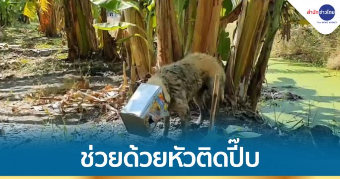 สงสารน้องหมาหัวติดปี๊บขนมเอาออกเองไม่ได้ กู้ภัยใช้กรรไกรตัดปี๊บก่อนง้างออกจนหัวสุนัขหลุดออกมาได้