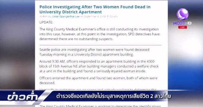 เหตุหญิงสาวชาวไทยเสียชีวิต 2 ศพที่เมืองซีแอตเทิล รัฐวอชิงตัน สหรัฐ ล่าสุดจนถึงขณะนี้ยังไม่มีคำแถลงอย่างเป็นทางการว่าสาเหตุเกิดจากอะไร ขณะที่ครอบครัวของผู้เสียชีวิตกำลังเตรียมทำเรื่องขอรับศพกลับมาบำเพ็ญกุศลที่ภูมิลำเนา
