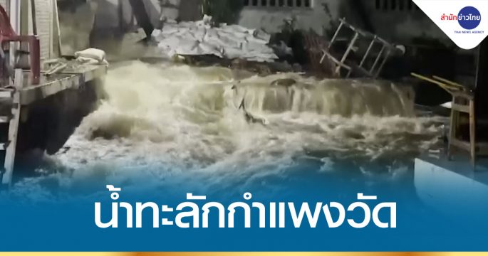 น้ำทะลุกำแพงวัดกลางเมืองอ่างทอง เร่งอุดวุ่นทั้งคืน