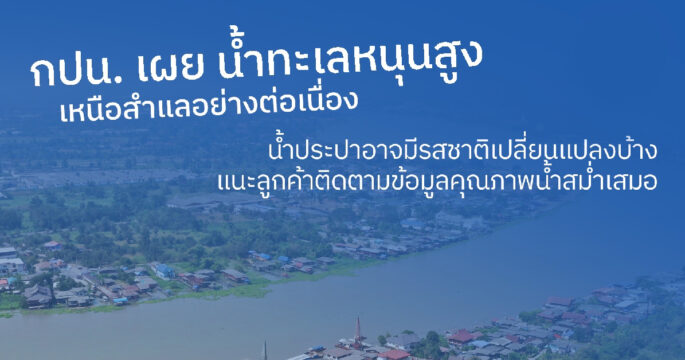 กปน. เผยน้ำทะเลหนุนสูงเหนือสำแล อ.เมือง จ.ปทุมธานี อย่างต่อเนื่อง น้ำประปาอาจมีรสชาติเปลี่ยนแปลงบ้าง แนะลูกค้าติดตามข้อมูลคุณภาพน้ำสม่ำเสมอ