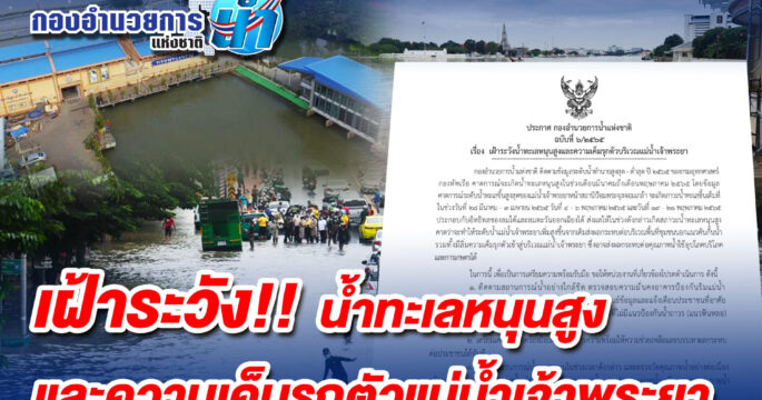 กองอำนวยการน้ำแห่งชาติ ออกประกาศ เรื่อง เฝ้าระวังน้ำทะเลหนุนสูงและความเค็มรุกตัวบริเวณแม่น้ำเจ้าพระยา 28 มีนาคม – 3 เมษายนนี้