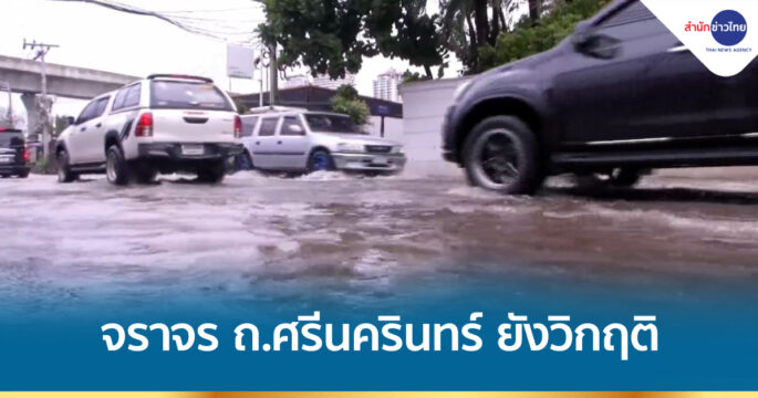 การจราจรบนถนนศรีนครินทร์ฝั่งขาออก มุ่งหน้าสี่แยกพัฒนาการ ยังติดขัดสลับหยุดนิ่ง หลังเมื่อคืนที่ผ่านมามีฝนตกลงมาอย่างหนักและเกิดน้ำท่วมขัง