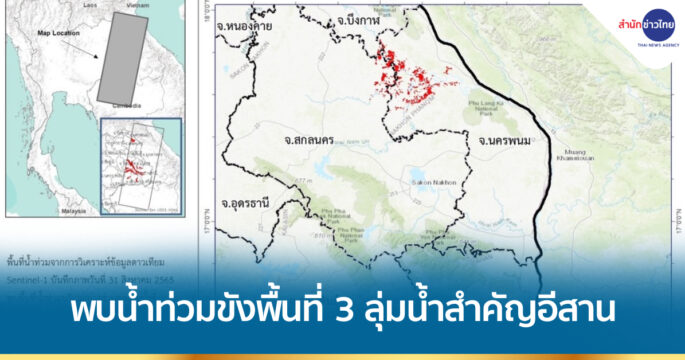 GISTDA เผยข้อมูลจากดาวเทียม Sentinel-1 พบน้ำท่วมขังในพื้นที่บางส่วนของลุ่มน้ำชี ลุ่มน้ำมูล และลุ่มน้ำโขงทางฝั่งตะวันออกเฉียงเหนือ ทั้งสิ้น 369,438 ไร่
