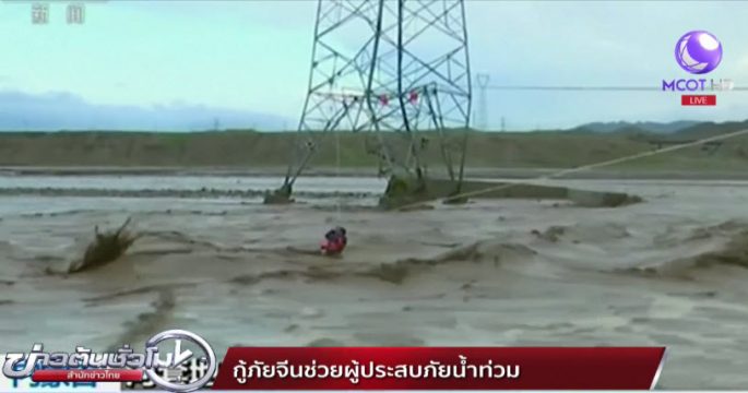 ทีมกู้ภัยเขตปกครองตนเองมองโกเลียใน ของจีน เข้าช่วยเหลือช่างไฟฟ้า 8 คนที่ติดค้างอยู่บนเสาส่งวิทยุ ซึ่งถูกกระแสน้ำท่วมที่ไหลเชี่ยวล้อมรอบ การช่วยเหลือต้องใช้เวลาถึง 15 ชั่วโมง