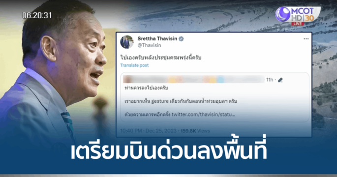 26 ธ.ค.- นายกฯ ห่วงสถานการณ์น้ำท่วม เตรียมบินด่วนลงพื้นที่นราธิวาส หลังประชุม ครม. วันนี้ สั่งเจ้าหน้าที่ไม่ต้องรอรับ หลายจังหวัดในพื้นที่จังหวัดภาคใต้ประสบอุทกภัย โดยเฉพาะจังหวัดนราธิวาสที่ได้รับรายงานว่าประสบความเดือดร้อนมากที่สุด นายเศรษฐา ทวีสิน นายกรัฐมนตรี มีความห่วงใยประชาชน ดังนั้นวันนี้ (26 ธ.ค.66) หลังการประชุมคณะรัฐมนตรีเสร็จสิ้น นายกรัฐมนตรีจะเดินทางไปยังจังหวัดนราธิวาส เพื่อตรวจดูสถานการณ์อุทกภัย แนวโน้มของสถานการณ์ ความพร้อมในการรับมือของหน่วยงาน แนวทางการบริหารจัดการน้ำ เช่น การระบายน้ำ รวมทั้งปัญหาความเดือดร้อนของประชาชนในพื้นที่ เพื่อจะแก้ไขและช่วยเหลือได้ตรงและทันสถานการณ์ อย่างไรก็ตามการลงพื้นที่ในครั้งนี้ นายกรัฐมนตรี ไม่ต้องการเพิ่มภาระแก่หน่วยงานและเจ้าหน้าที่ในการต้อนรับโดยให้กำลังทั้งหมดมุ่งไปที่การช่วยเหลือประชาชนและแก้ไขสถานการณ์ .-สำนักข่าวไทย