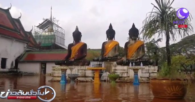ฝนที่ตกมาอย่างหนักใน อ.ไชยา จ.สุราษฎร์ธานี ทำให้ป่าทะลักท่วมขังวัดพระบรมธาตุไชยาราชวรวิหาร และเอ่อล้นท่วมเข้าไปถึงโบสถ์ ระดับน้ำสูงประมาณ 30-40 ซม.