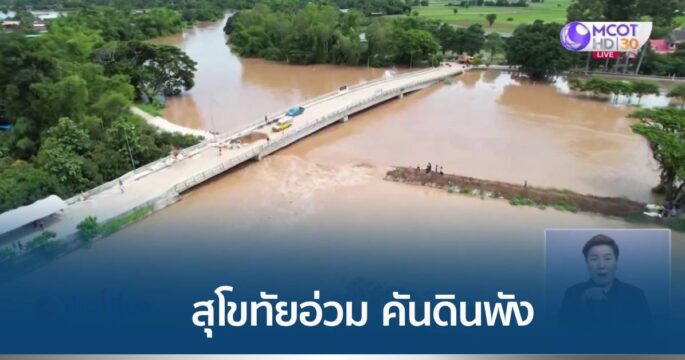 เฝ้าระวังทุกนาที น้ำยมที่ไหลผ่านเขตเศรษฐกิจตัวเมืองสุโขทัย เริ่มปริ่มคันกั้นน้ำ ส่วนคันดินกันน้ำต.ยางซ้าย อ.เมืองสุโขทัย น้ำยมกัดเซาะขาดยาวกว่า 50 เมตร ทะลักท่วมพื้นที่เป็นวงกว้าง