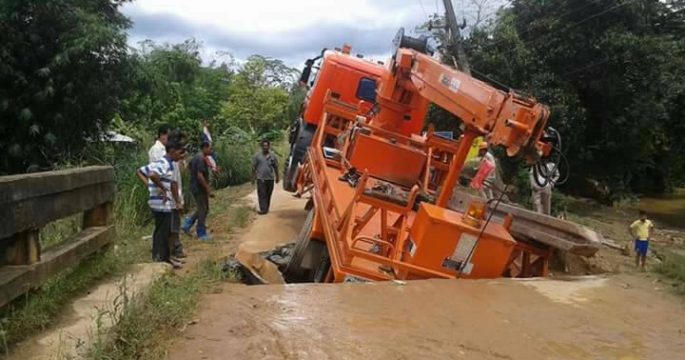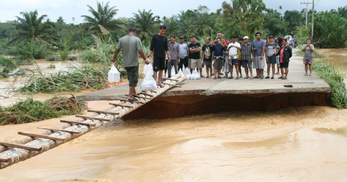 สุราษฎร์ฯ สู้น้ำท่วมเซาะถนนขาดใช้ต้นหมากพาดแทน