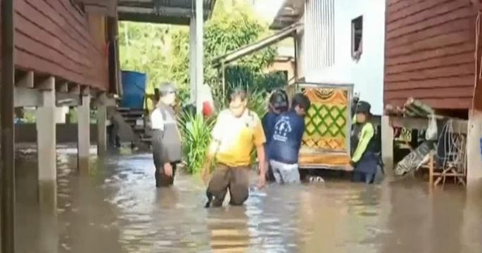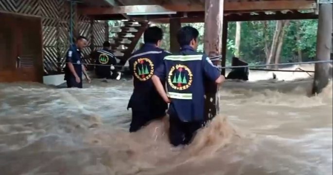 กาญจนบุรี 24 ก.ย.- กาญจนบุรีฝนตกหนักตลอดคืน อำเภอทองผาภูมิน้ำป่าหลากท่วมวัดป่าผาตาดสูงเกือบเมตร กู้ภัยเร่งช่วยปลอดภัยทั้งพระสงฆ์และแม่ชี เมื่อเวลา 06.30 น. (24 ก.ย.) เจ้าหน้าที่มูลนิธิกู้ภัยกาญจนบุรีพร้อมนำกำลังกว่า 20 นาย เข้าช่วยเหลือวัดป่าผาตาด ต.หินดาด อ.ทองผาภูมิ จ.กาญจนบุรี ตั้งอยู่บริเวณเชิงเขา หลังจากมีฝนตกหนักตลอดคืนที่ผ่านมา และมีปริมาณน้ำสะสมบนเขาจำนวนมากได้ไหลหลากลงมาอย่างรวดเร็วท่วมบริเวณวัดสูงเกือบ 1 เมตร บางจุดน้ำไหลเชี่ยว เกรงว่าจะเป็นอันตรายกับพระสงฆ์ เจ้าหน้าที่จึงใช้เชือกโยงเพื่อใช้ยึดเกาะออกมาอยู่ในจุดปลอดภัยทั้งพระสงฆ์ 6 รูป และแม่ชี 4 คน พร้อมขนย้ายสิ่งของขึ้นที่สูงและรอให้ระดับน้ำลดลง.-สำนักข่าวไทย