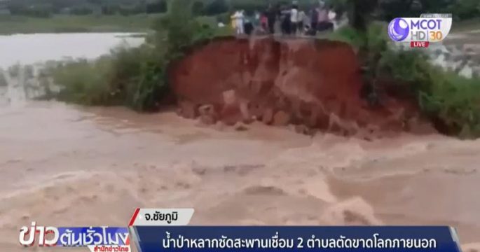 ฝนตกหนักบนเทือกเขาภูแลนคา จ.ชัยภูมิ เกิดน้ำป่าหลากลงเขื่อนลำปะทาว และกระแสน้ำที่เชี่ยวกรากทำให้สะพานเชื่อม 2 ตำบลถูกตัดขาด