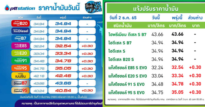 น้ำมันขึ้นอีก! พรุ่งนี้ (16 ธ.ค.65) ผู้ค้าปรับขึ้นราคาน้ำมันกลุ่มเบนซินและแก๊สโซฮอล์ทุกชนิด 30 สตางค์/ลิตร ส่วนกลุ่มดีเซลคงเดิม มีผลเวลา 05.00 น. เป็นต้นไป